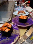 Sushi of every kind sits on little plates, each plate with its own price, and rotates clockwise on a conveyor belt. If it looks good, you grab the plate and eat it. At the end of the meal, the attendant came over and waved some sort of device over the stack of plates getting the amount for us to pay. We still don’t know how the total was calculated, but it seemed to work.