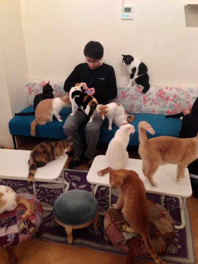 He’s got cat treats. That makes him the most popular man in the Cat Cafe.