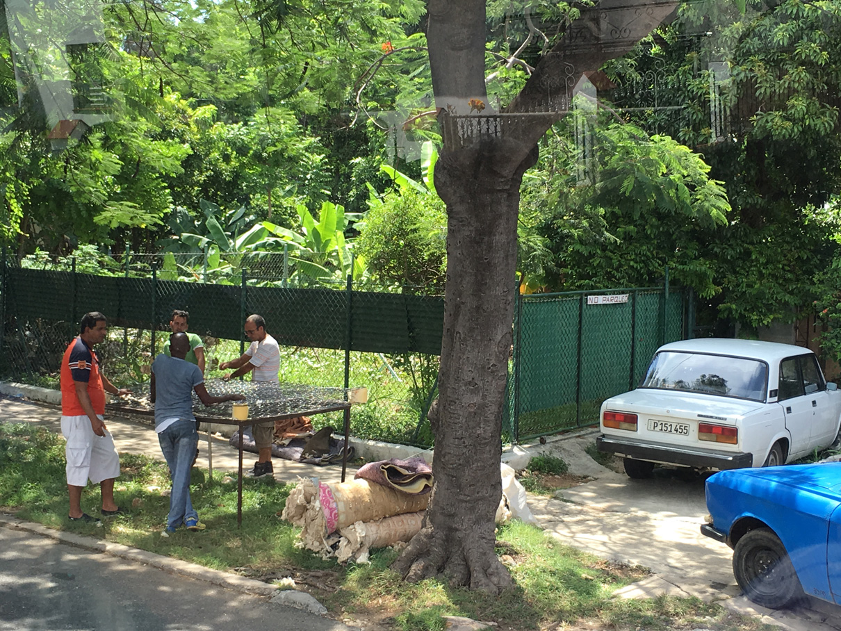 Taken from the window of the bus, these guys are refurbishing an old mattress. Waste not, want not.