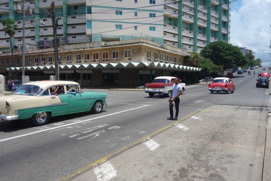 A man waiting to hitch a ride in Havana. Hitchhiking is a very popular form of transportation. The government encourages drivers to pick up traveling comrades.
