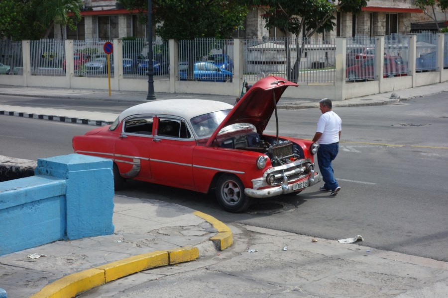 The old cars look cool but ran out of warranty a half-century ago. I helped this poor guy push his car for a few feet. While we drank our beer he got it started again and was off…