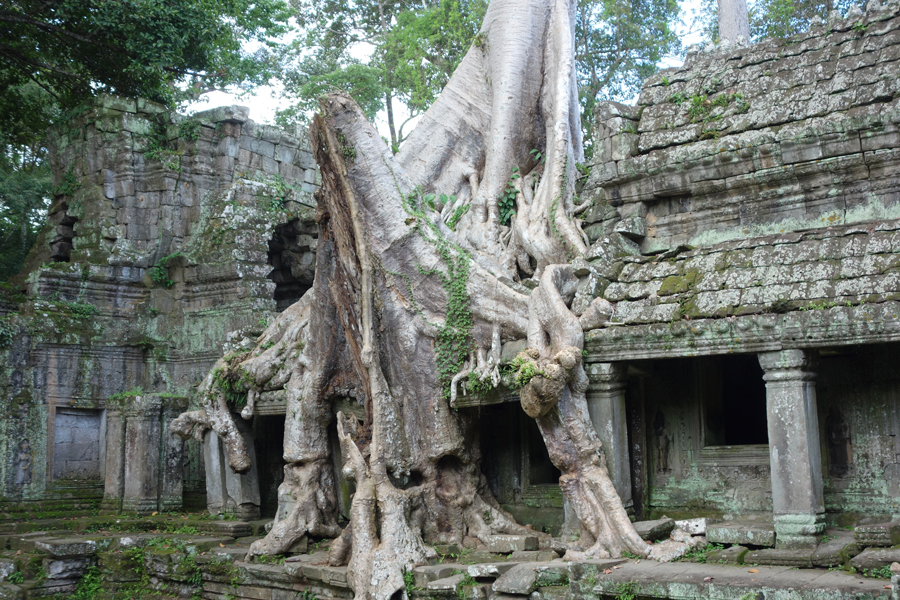 Banyan tree roots have grown over and into this section of one of the temples. Some temples have only been recently discovered and much of the damage done by the jungle growth cannot be undone.