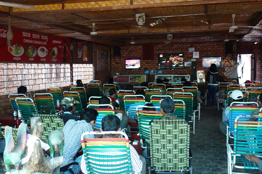 Drive-in picture show. On a dusty side-street people sit in lawn chairs and watch movies/TV shows on three screens. The volume was up loud on the center screen.