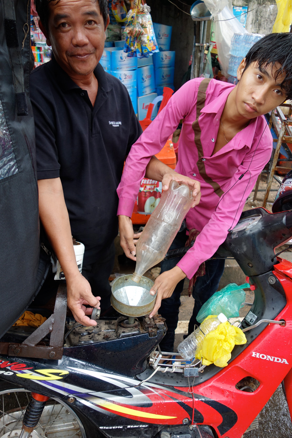 Our tuk-tuk driver for the day (left) filling up the moped at the local ‘gas station.’ There are a few ‘real’ gas stations, but most gas is sold at roadside stands that sell it by the liter or half-liter. The most popular containers were old Johnny Walker bottles.