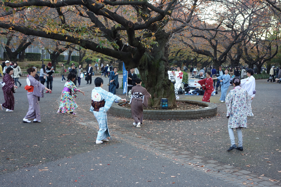 In Ueno Park, a group of people perform traditional Japanese dances. They seemed to be in some sort of dance club and were just there for fun.