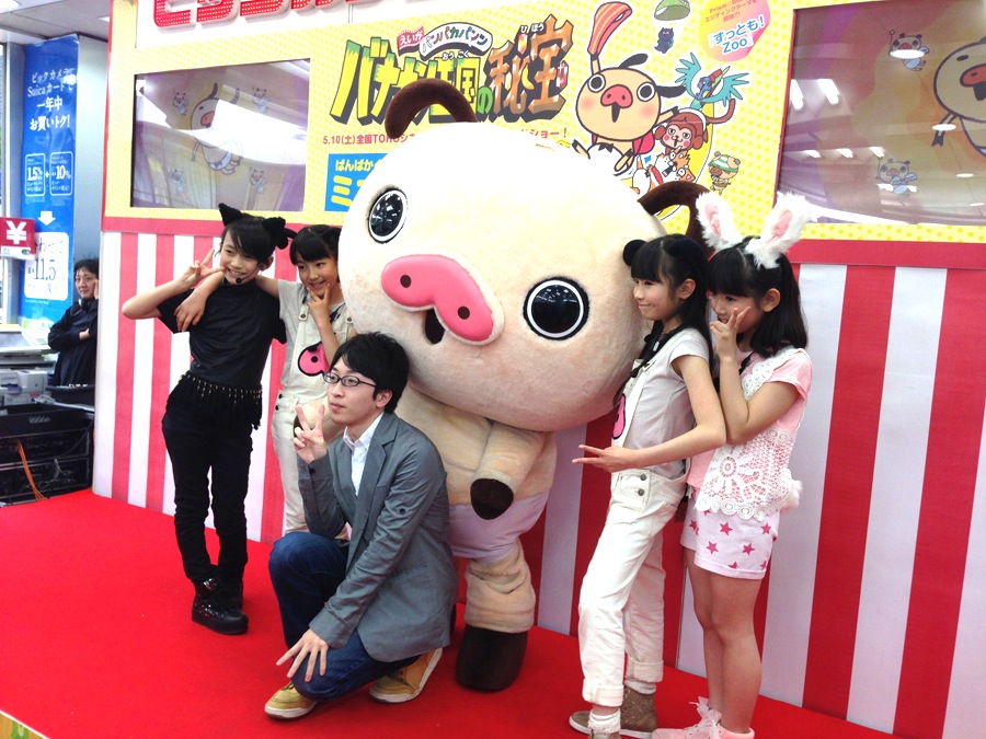 This is an unknown mascot at the entrance to Bic Camera (a crazy store that sells electronics and almost everything else). A huge crowd was watching and waiting to take pictures. The four girls are part of the show. The guy in front is being sought for questioning.