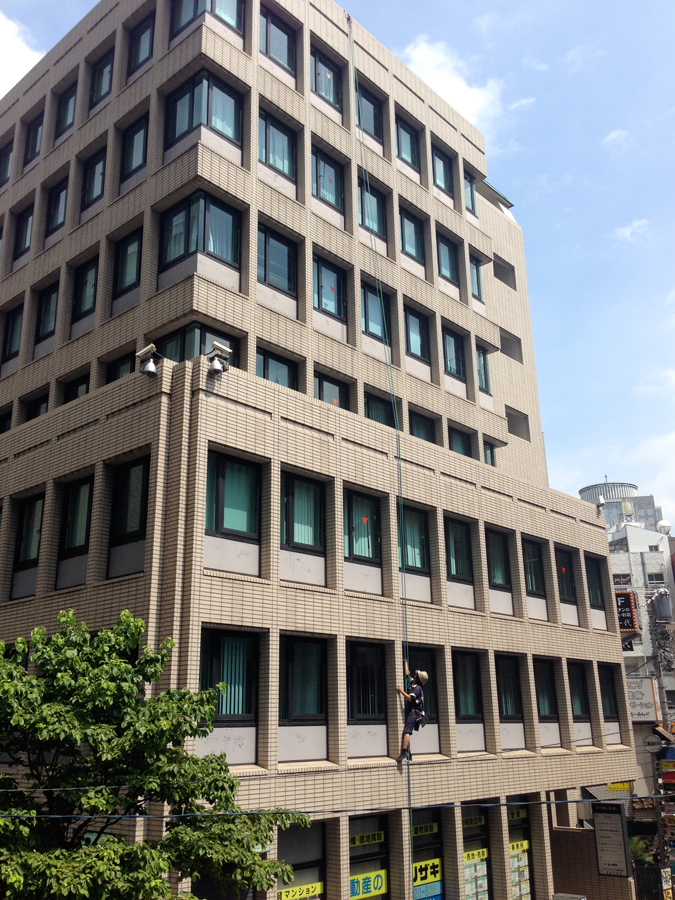 A window washer hanging from an Ebisu building. They rappel from the top and work their way down.