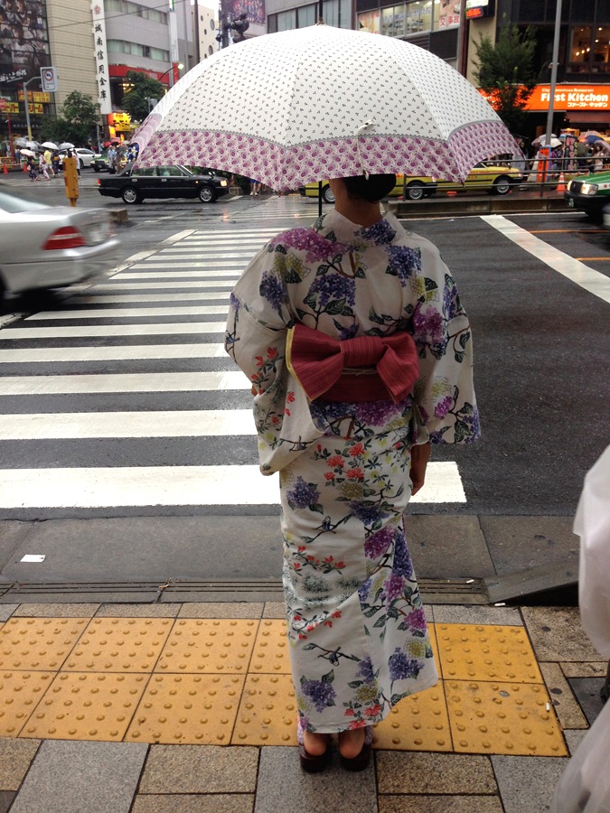 A woman wearing the traditional summer yukata waits to cross the street towards the stadium for the fireworks show.