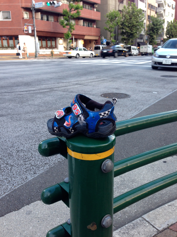 A kid’s shoe waiting to be ‘found.’ It most likely fell from a kid riding on the back of mom’s bike. Things unknowingly dropped are usually left where they are so the owner may reclaim them.