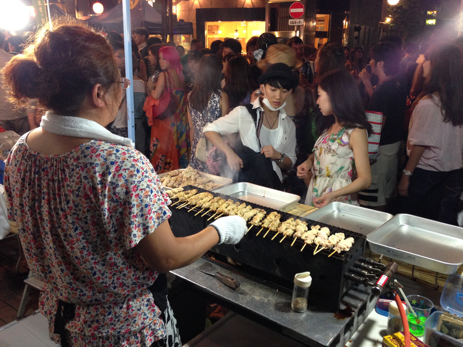 All sorts of delicacies were being cooked on portable grills. This is some sort of yakitori (meat grilled on a stick).