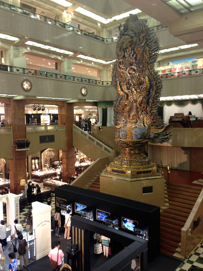 The central hall of Mitsukoshi department store. The intricate statue is almost three stories tall.