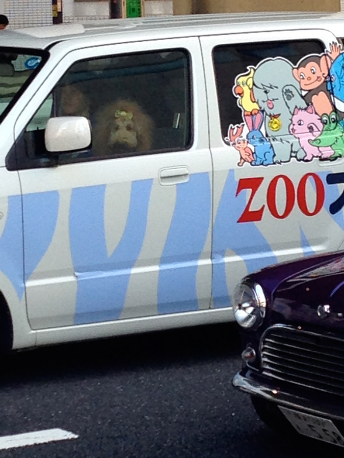 Pardon the fuzzy shot (zoomed iPhone). Not sure what business the van’s sign is promoting, but the dog in the front seat was a fairly large poodle with hair cut to look like a lion. Very funny.