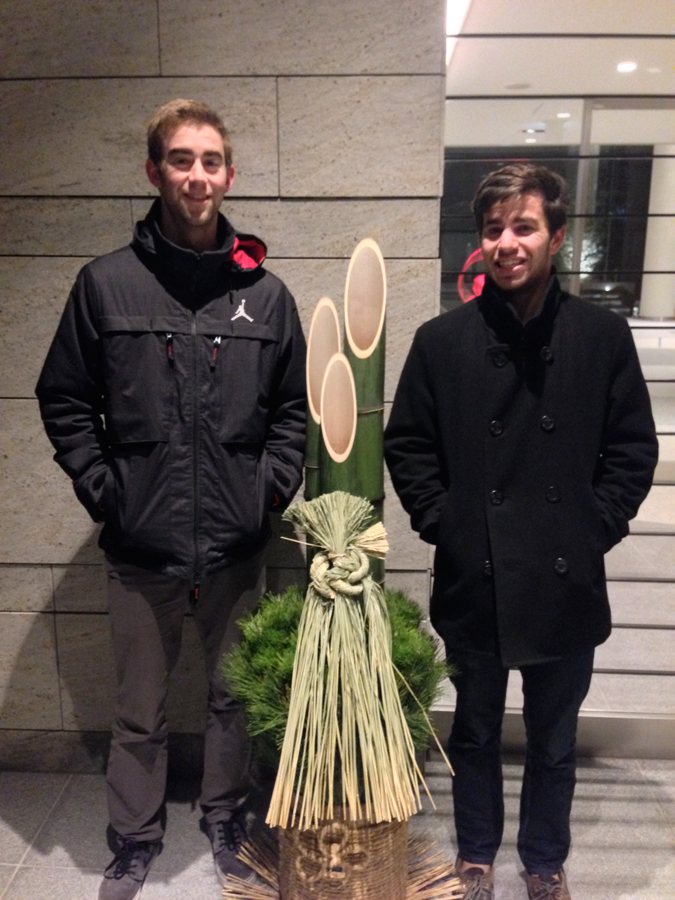 Specht and Matthew with the ‘kadomatsu,’ at our apartment, a pair of which is placed on either side of doors for the first week of the year. They are made of pine, bamboo and plum, each considered ‘auspicious’ plants…especially the pine as it is a symbol of longevity.